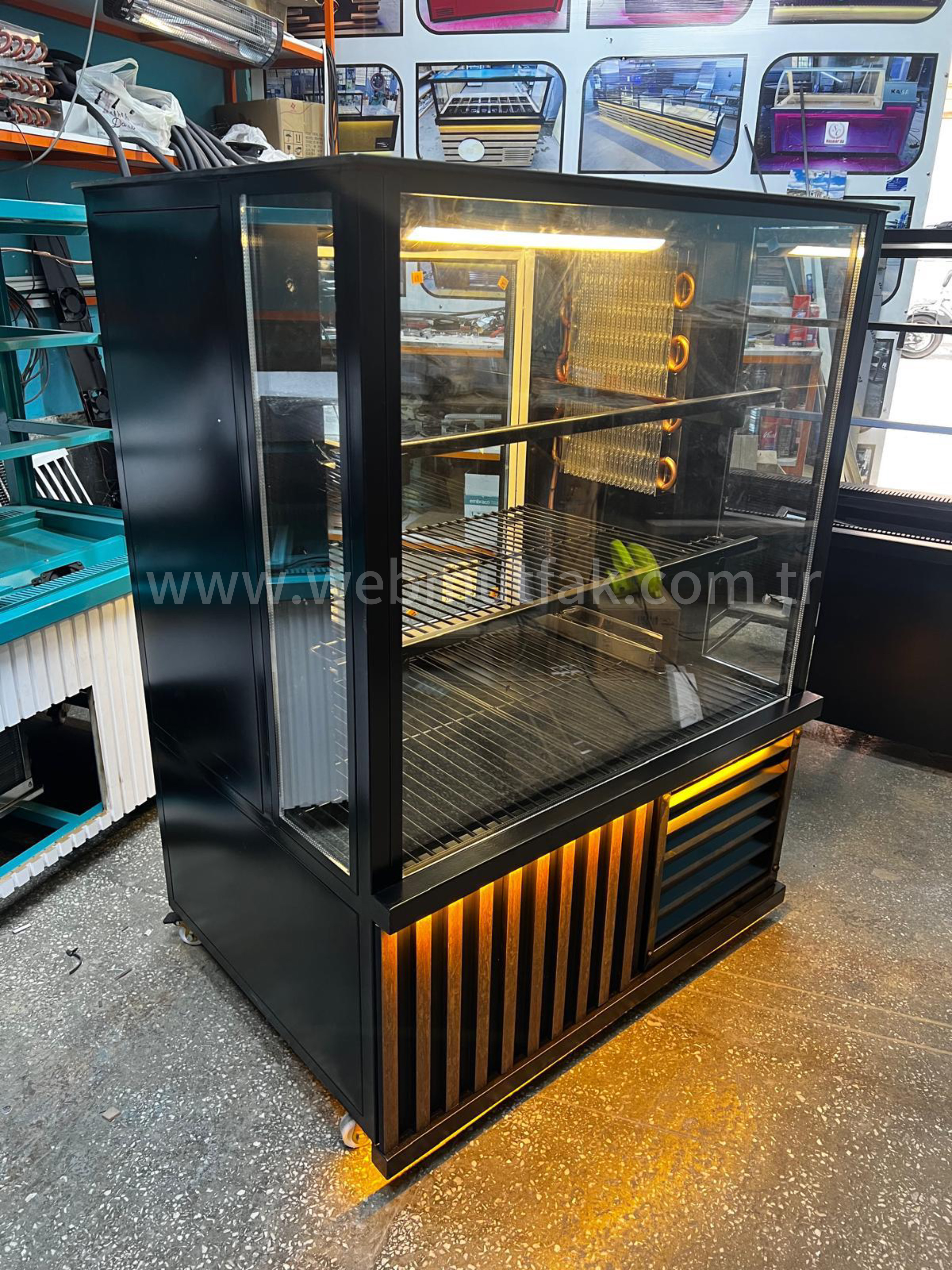 Kebap Dolabı, restoran, kebapçı, dönerci, cafe ve yiyecek servis alanlarında kullanıma uygun, profesyonel bir soğutmalı teşhir ve saklama dolabıdır. Bu model, kebap çeşitleri, salatalar, garnitürler, marineler ve soğuk servis ürünlerinin ideal sıcaklıkta korunarak hijyenik ve estetik şekilde teşhir edilmesini sağlar. Cam teşhir yüzeyi sayesinde ürünler vitrinde net şekilde görünür ve müşterilerin seçim yapma süreci kolaylaşır, bu da satış performansını artırır.